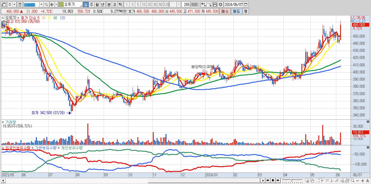 - 오뚜기 (466,000원 ▲ 4.72% , 시총: 18,676억, 거래량: 19,953, 거래대금:93억, KOSPI)