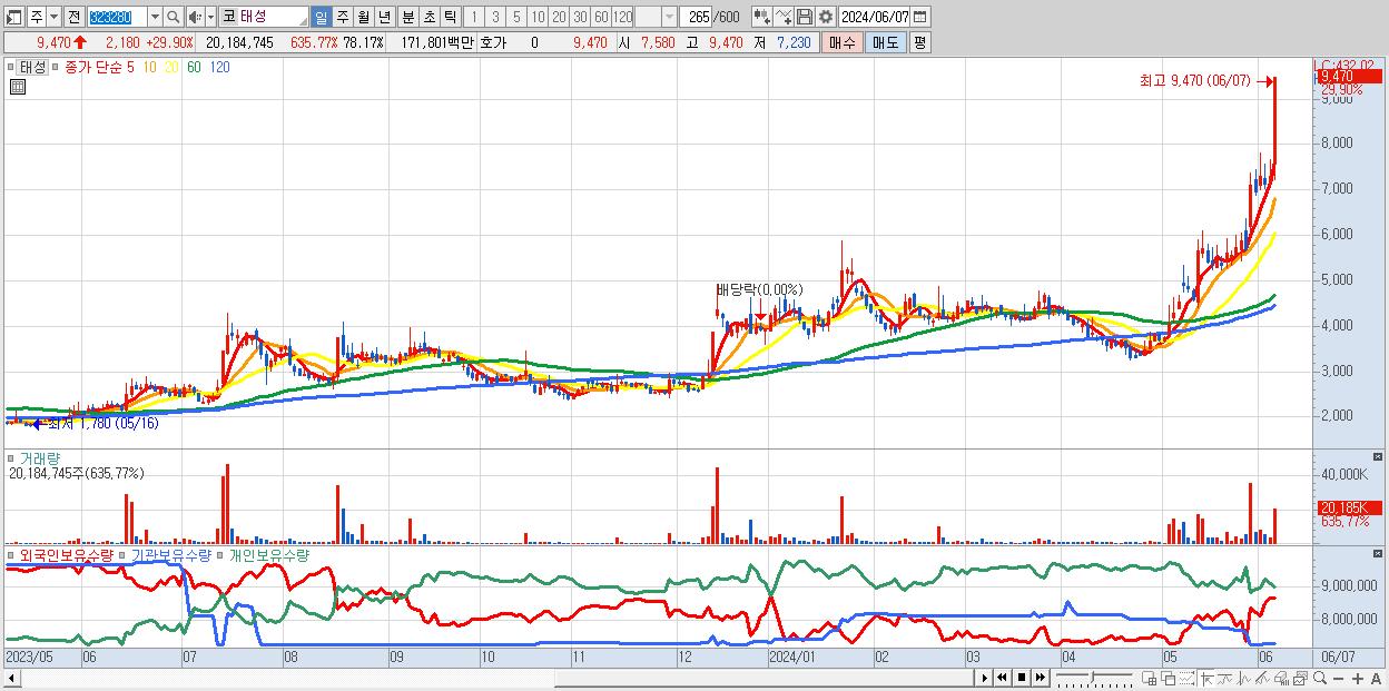 태성 9,470원 ▲ 29.9% (KOSDAQ, 323280)