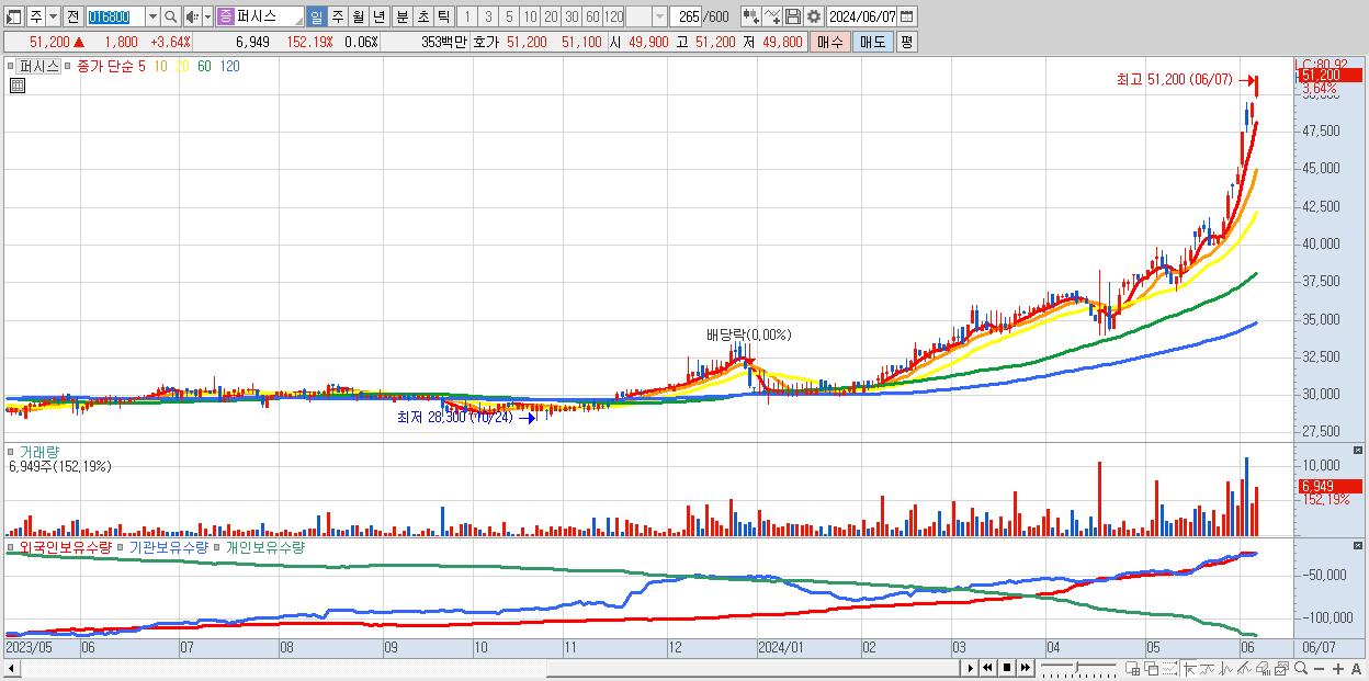 - 퍼시스 (51,200원 ▲ 3.64% , 시총: 5,888억, 거래량: 6,949, 거래대금:4억, KOSPI)