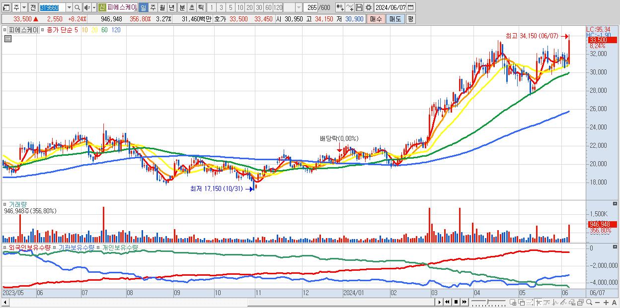 - 피에스케이 (33,500원 ▲ 8.24% , 시총: 9,704억, 거래량: 946,948, 거래대금:315억, KOSDAQ)
