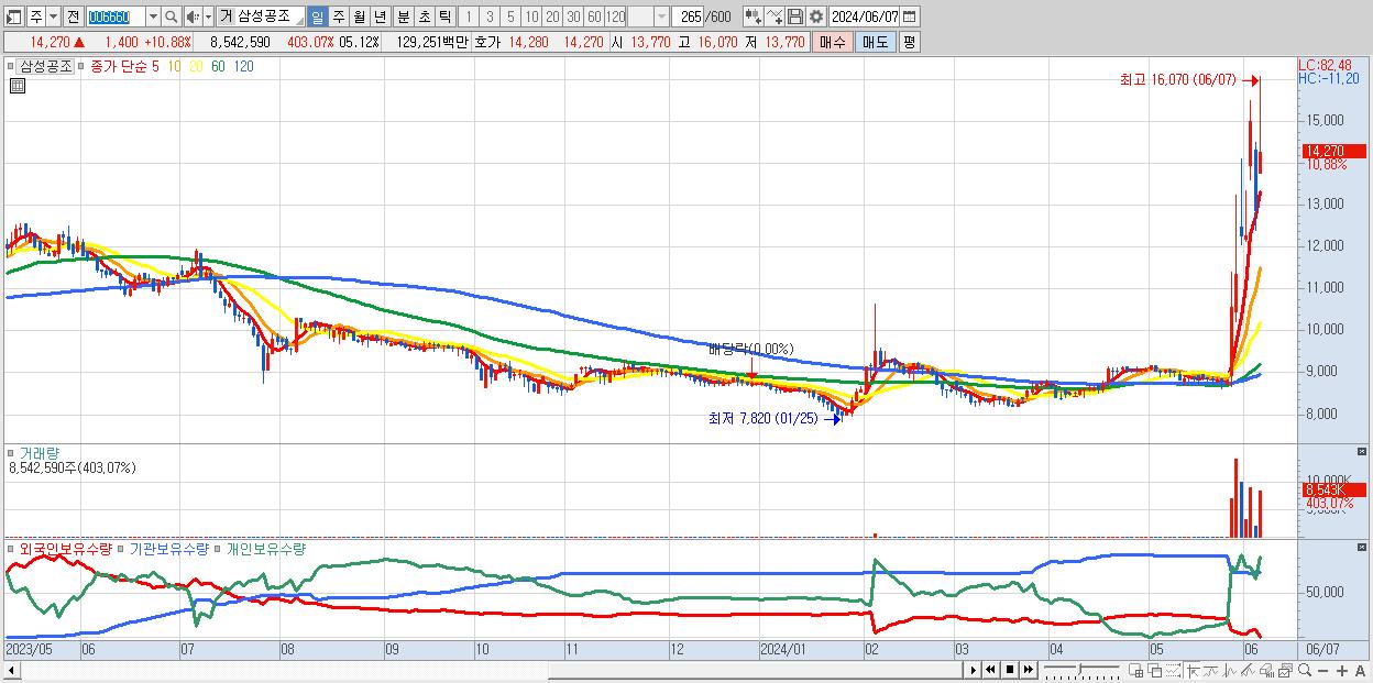 - 삼성공조 (14,270원 ▲ 10.88% , 시총: 1,160억, 거래량: 8,542,590, 거래대금:1,293억)