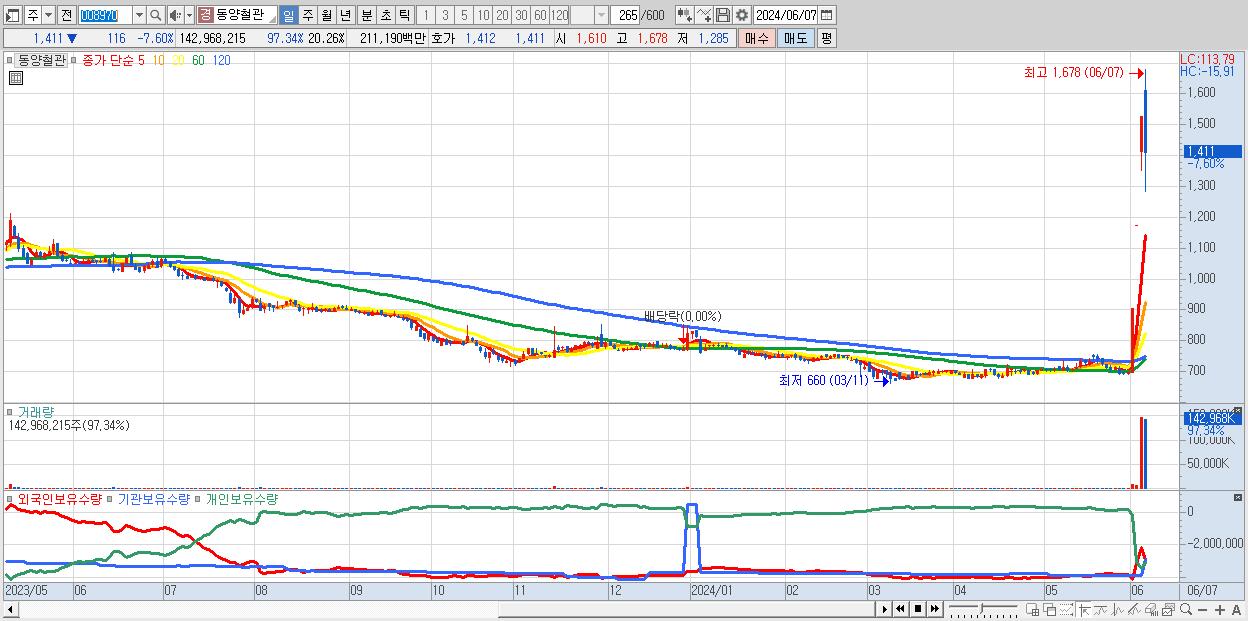 - 동양철관 (1,411원 ▼ -7.6% , 시총: 1,677억, 거래량: 142,968,215, 거래대금:2,112억)