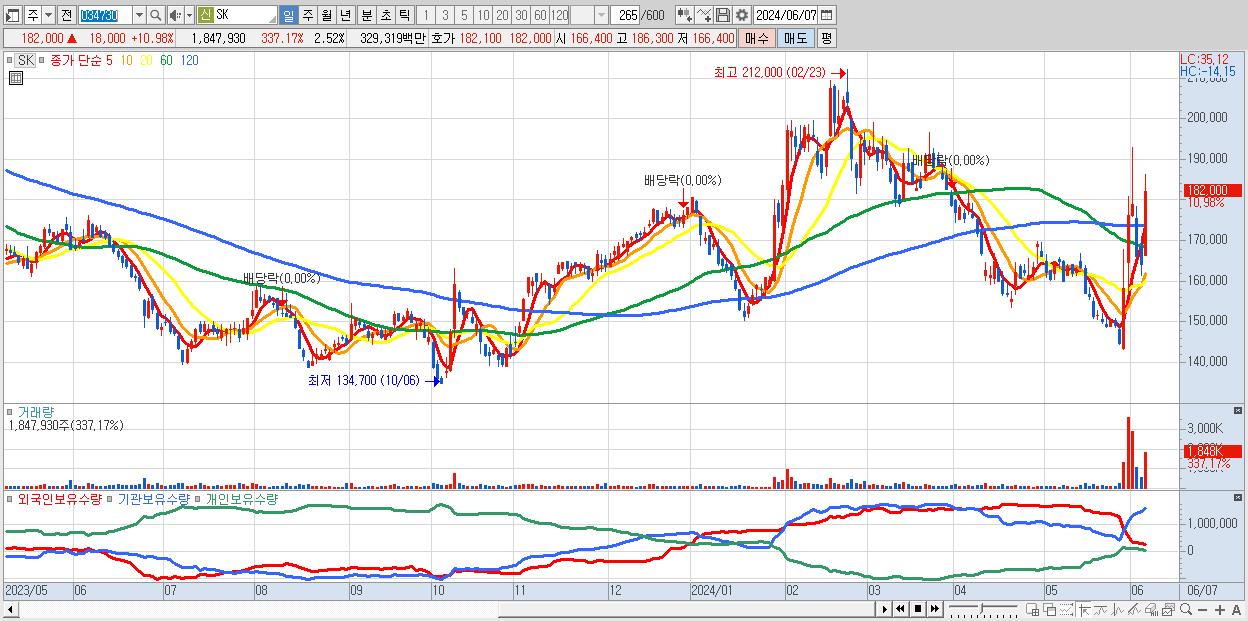 - SK (182,000원 ▲ 10.98% , 시총: 133,221억, 거래량: 1,847,930, 거래대금:3,293억)