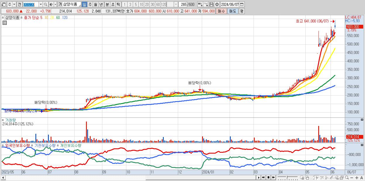 - 삼양식품 (603,000원 ▲ 3.79% , 시총: 45,424억, 거래량: 214,014, 거래대금:1,313억)