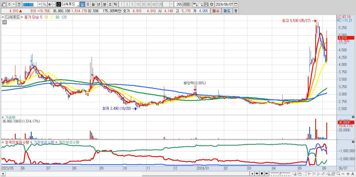 - CJ씨푸드 (4,910원 ▲ 19.76% , 시총: 1,764억, 거래량: 36,860,108, 거래대금:1,753억)