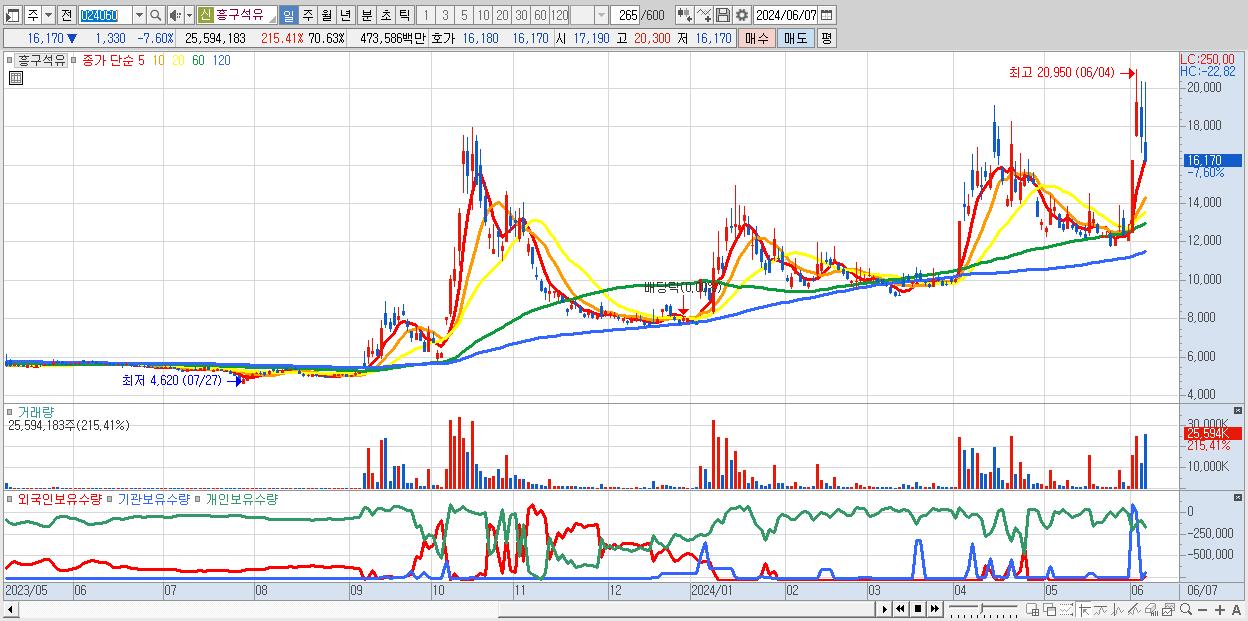 - 흥구석유 (16,170원 ▼ -7.6% , 시총: 2,426억, 거래량: 25,594,183, 거래대금:4,736억)