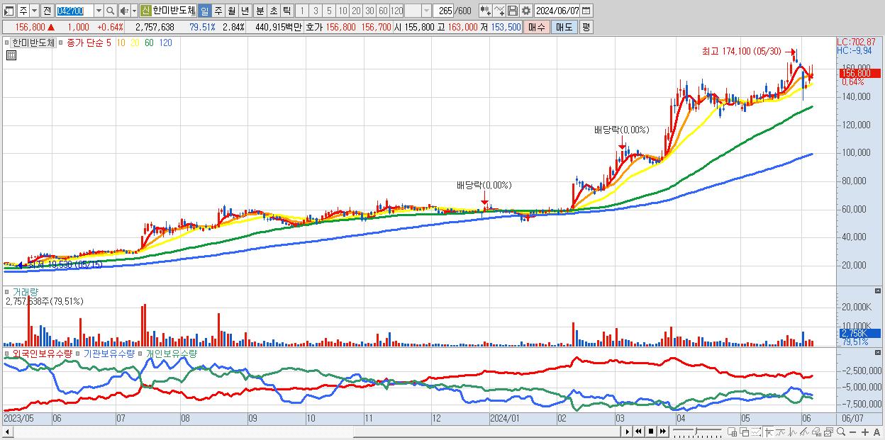 - 한미반도체 (156,800원 ▲ 0.64% , 시총: 152,086억, 거래량: 2,757,638, 거래대금:4,409억)