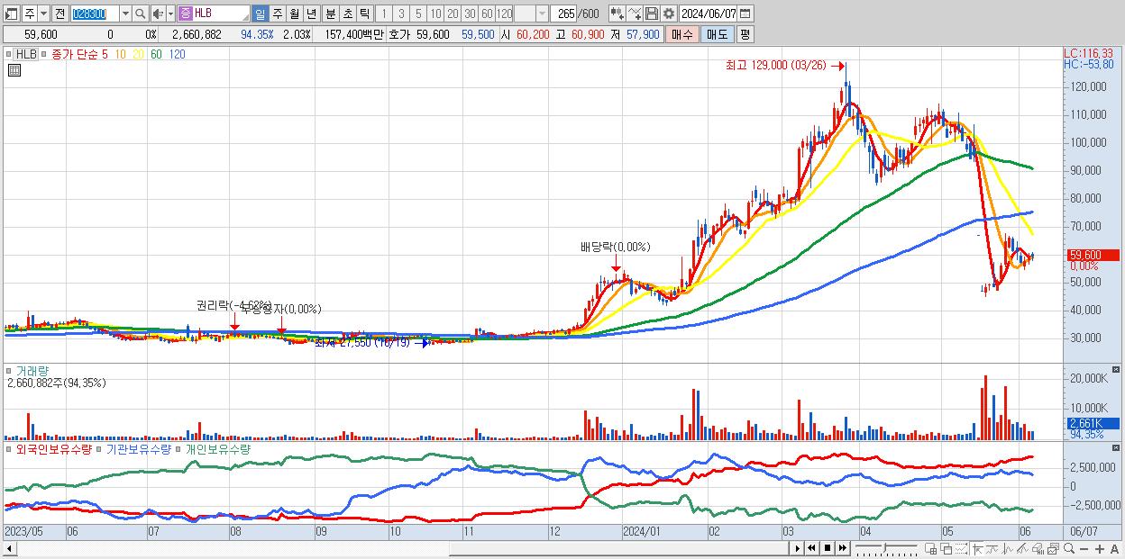 - HLB (59,600원 0% , 시총: 77,984억, 거래량: 2,660,882, 거래대금:1,574억)