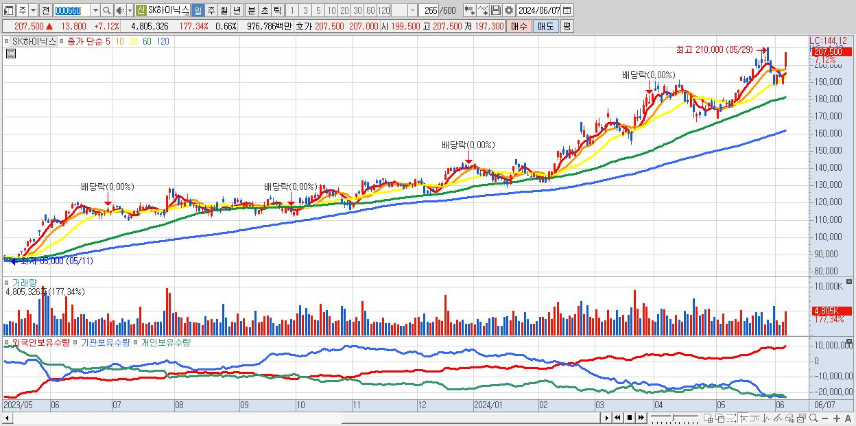- SK하이닉스 (207,500원 ▲ 7.12% , 시총: 1,510,605억, 거래량: 4,805,326, 거래대금:9,768억)