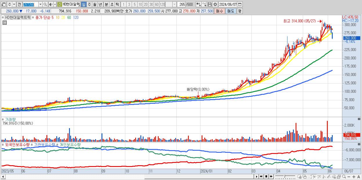 - HD현대일렉트릭 (260,000원 ▼ -6.14% , 시총: 93,723억, 거래량: 794,916, 거래대금:2,099억)