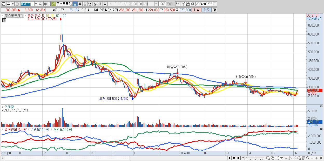 - 포스코퓨처엠 (282,000원 ▲ 2.36% , 시총: 218,446억, 거래량: 469,137, 거래대금:1,311억)