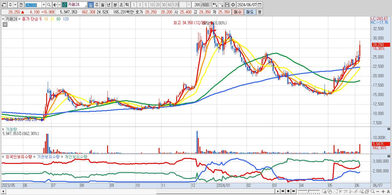 - 카페24 (28,250원 ▲ 16.98% , 시총: 6,851억, 거래량: 5,947,353, 거래대금:1,652억)