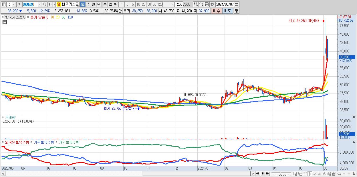 - 한국가스공사 (38,200원 ▼ -12.59% , 시총: 35,264억, 거래량: 3,258,881, 거래대금:1,307억)