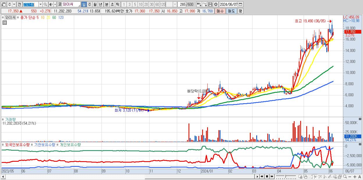 - 와이씨 (17,350원 ▲ 3.27% , 시총: 14,235억, 거래량: 11,202,283, 거래대금:1,956억)