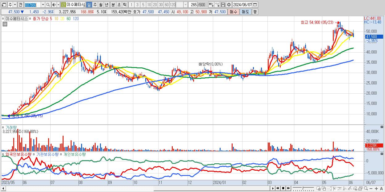 - 이수페타시스 (47,500원 ▼ -2.96% , 시총: 30,042억, 거래량: 3,227,956, 거래대금:1,594억)