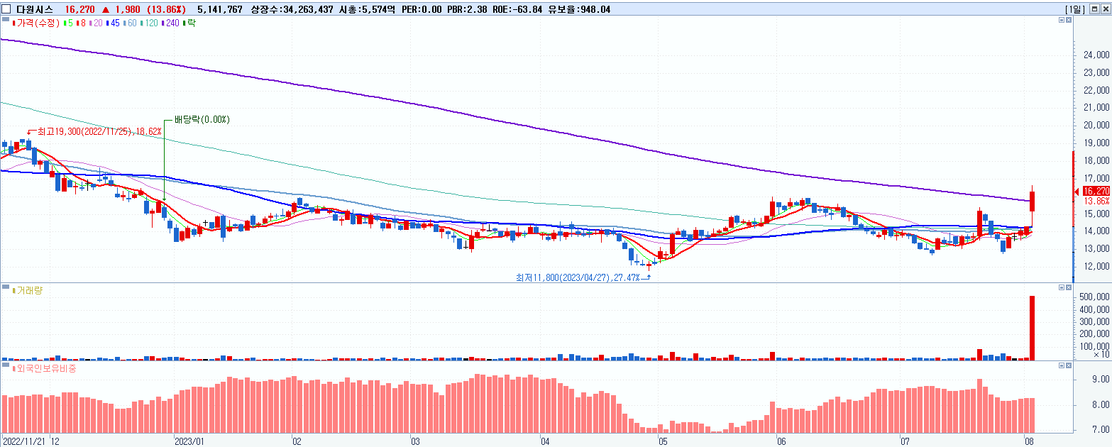 시총: 811억 거래량: 19,118,158 거래대금:310억