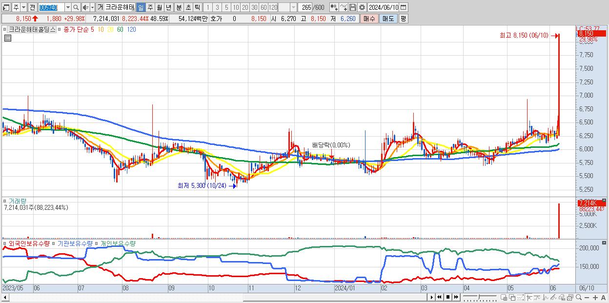 크라운해태홀딩스 8,150원 ▲ 29.98% (KOSPI, 005740)