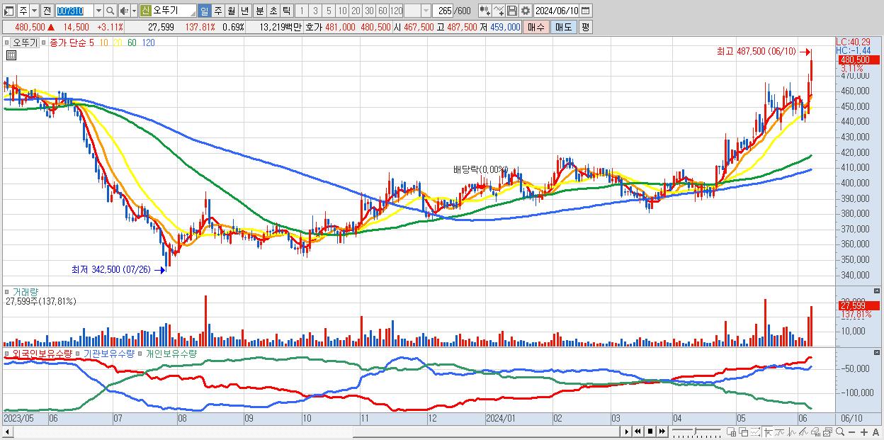 - 오뚜기 (480,500원 ▲ 3.11% , 시총: 19,258억, 거래량: 27,599, 거래대금:132억, KOSPI)