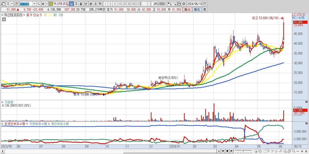 - 덕산테코피아 (51,000원 ▲ 23.49% , 시총: 10,179억, 거래량: 4,138,398, 거래대금:2,052억, KOSDAQ)