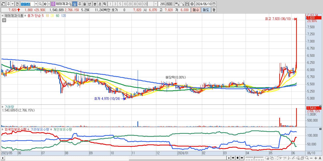 - 해태제과식품 (7,820원 ▲ 29.9% , 시총: 2,277억, 거래량: 1,540,689, 거래대금:112억, KOSPI)