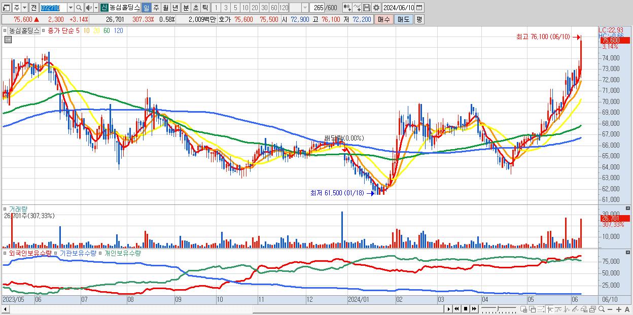 - 농심홀딩스 (75,600원 ▲ 3.14% , 시총: 3,506억, 거래량: 26,701, 거래대금:20억, KOSPI)