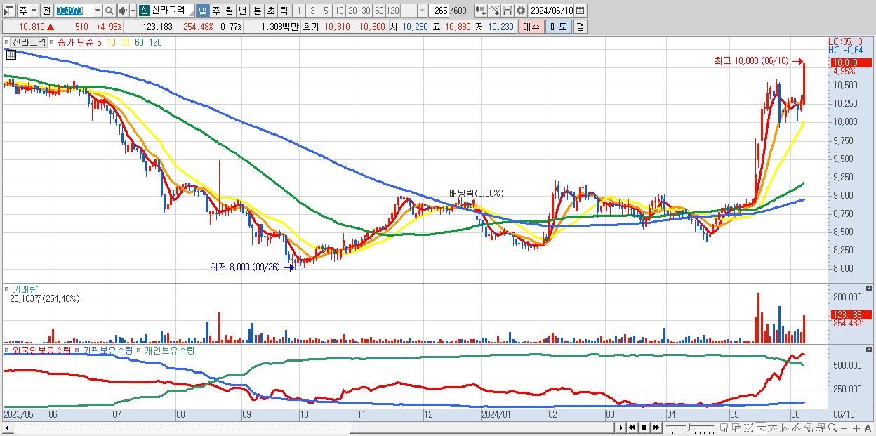 - 신라교역 (10,810원 ▲ 4.95% , 시총: 1,730억, 거래량: 123,183, 거래대금:13억, KOSPI)