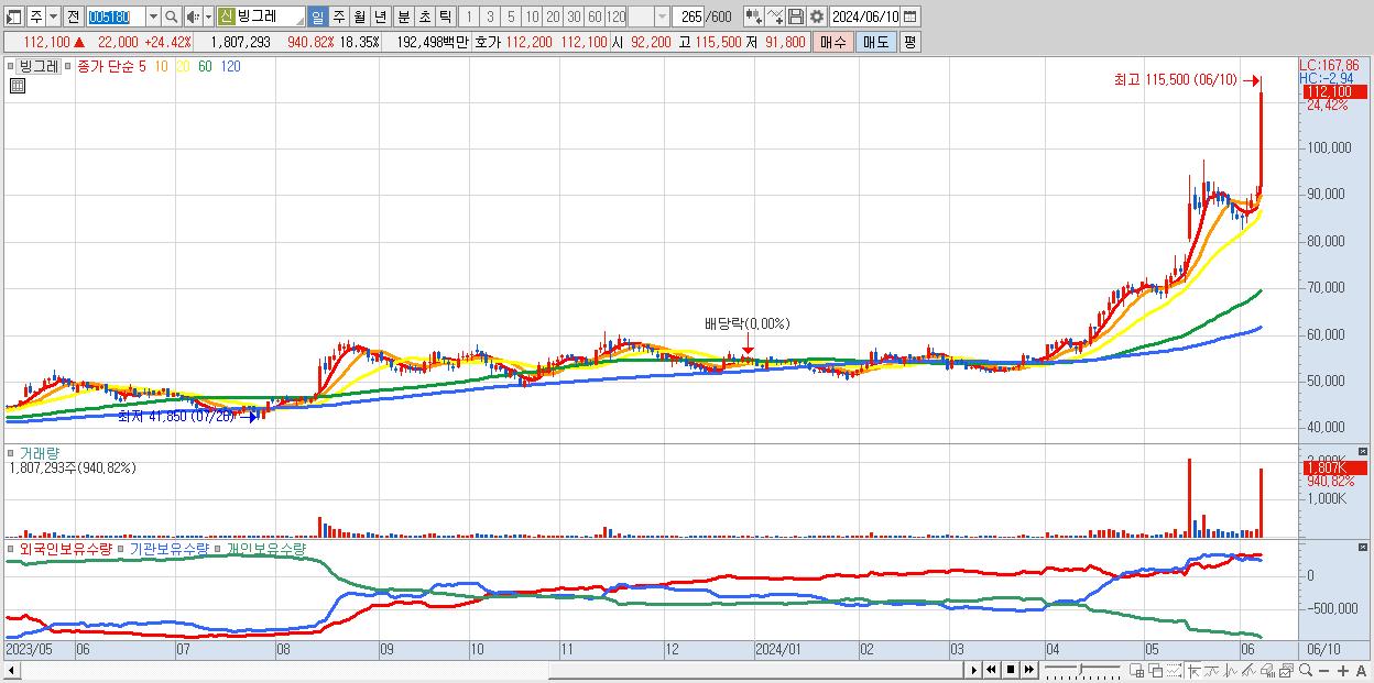 - 빙그레 (112,100원 ▲ 24.42% , 시총: 11,043억, 거래량: 1,807,293, 거래대금:1,925억, KOSPI)