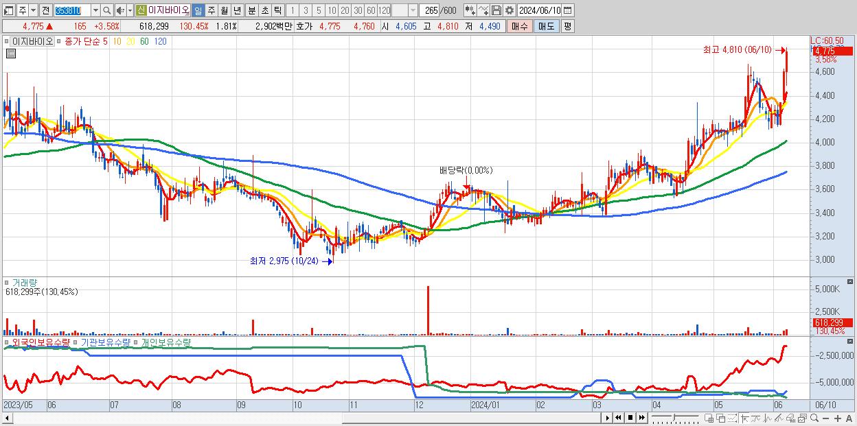 - 이지바이오 (4,775원 ▲ 3.58% , 시총: 1,633억, 거래량: 618,299, 거래대금:29억, KOSDAQ)