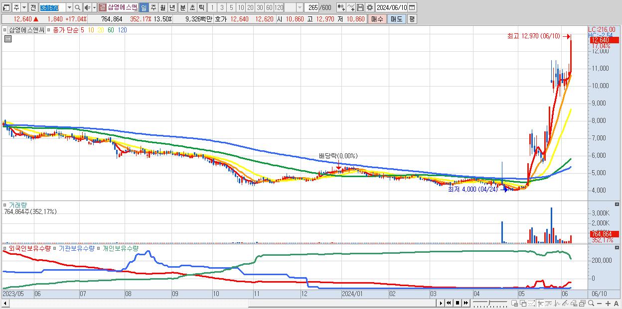 - 삼영에스앤씨 (12,640원 ▲ 17.04% , 시총: 716억, 거래량: 764,864, 거래대금:93억, KOSDAQ)