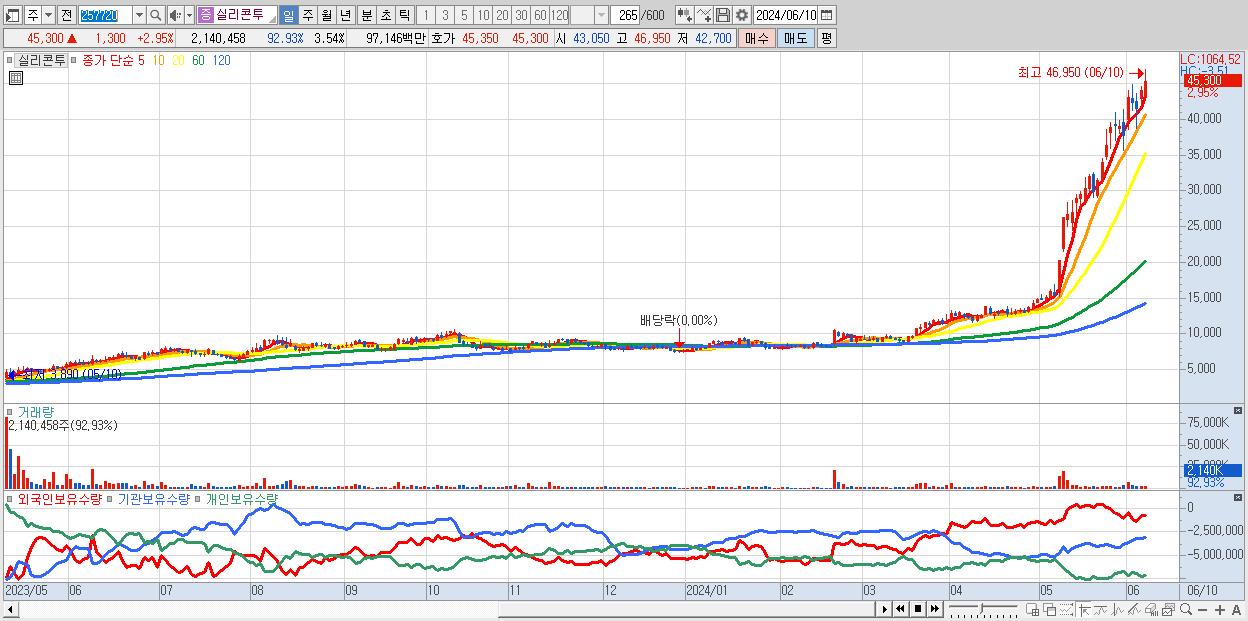 - 실리콘투 (45,300원 ▲ 2.95% , 시총: 27,356억, 거래량: 2,140,458, 거래대금:971억, KOSDAQ)