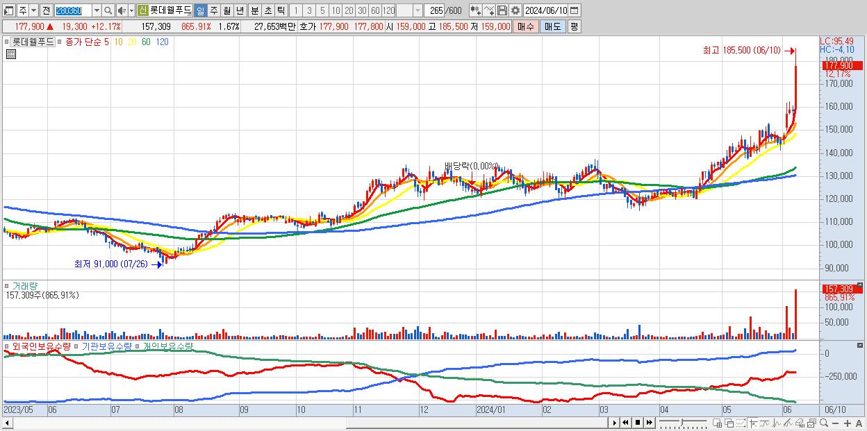- 롯데웰푸드 (177,900원 ▲ 12.17% , 시총: 16,784억, 거래량: 157,309, 거래대금:277억, KOSPI)