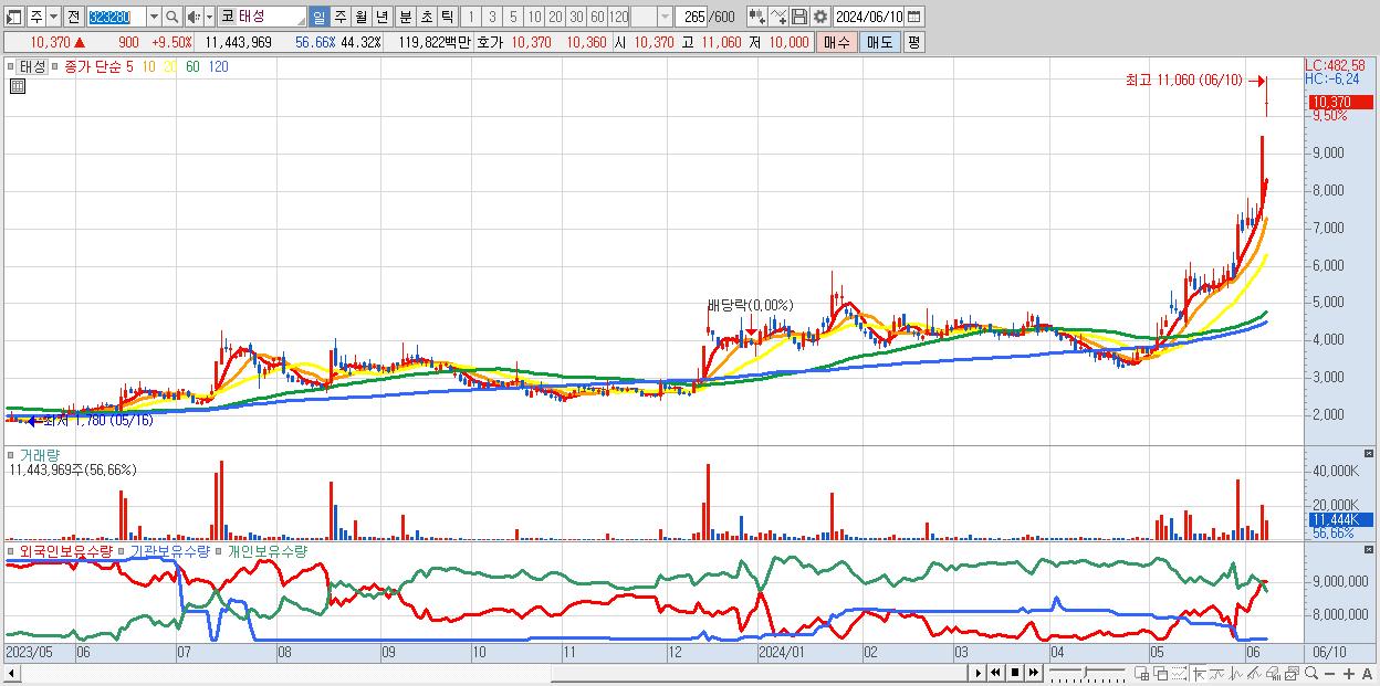 - 태성 (10,370원 ▲ 9.5% , 시총: 2,678억, 거래량: 11,443,969, 거래대금:1,198억, KOSDAQ)