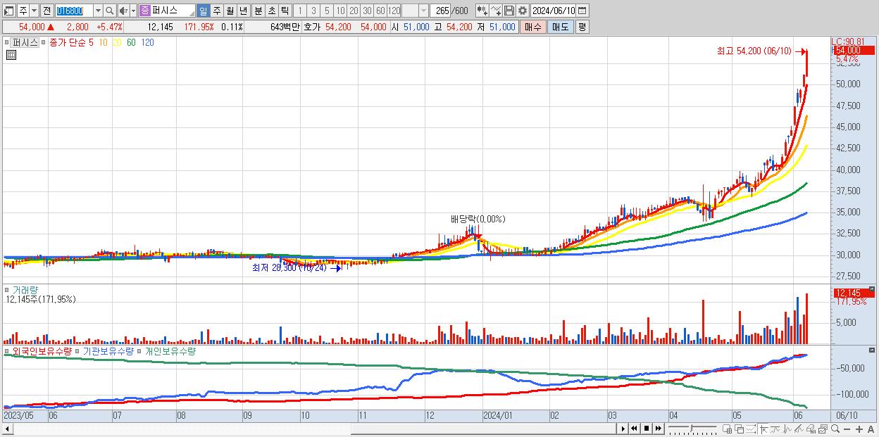 - 퍼시스 (54,000원 ▲ 5.47% , 시총: 6,210억, 거래량: 12,145, 거래대금:6억, KOSPI)