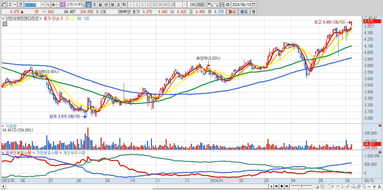 - 신한서부티엔디리츠 (4,475원 ▲ 1.94% , 시총: 2,504억, 거래량: 64,467, 거래대금:3억, KOSPI)