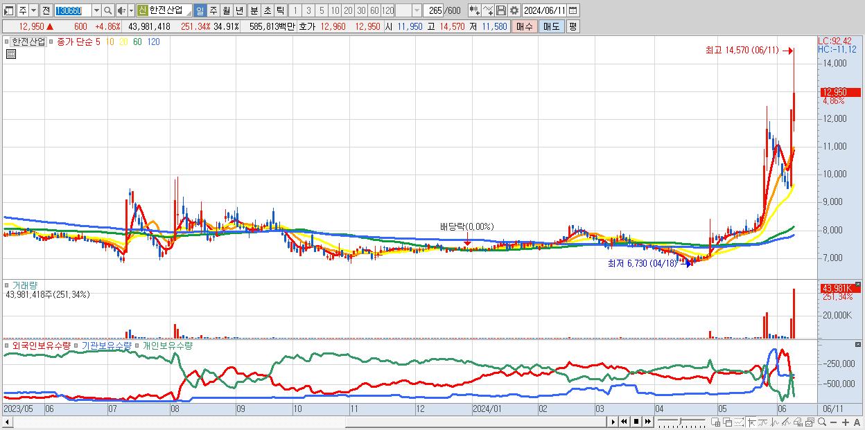- 한전산업 (12,950원 ▲ 4.86% , 시총: 4,222억, 거래량: 43,981,418, 거래대금:5,858억, KOSPI)