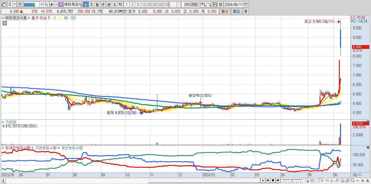 - 해태제과식품 (8,490원 ▲ 8.57% , 시총: 2,472억, 거래량: 4,415,787, 거래대금:400억, KOSPI)