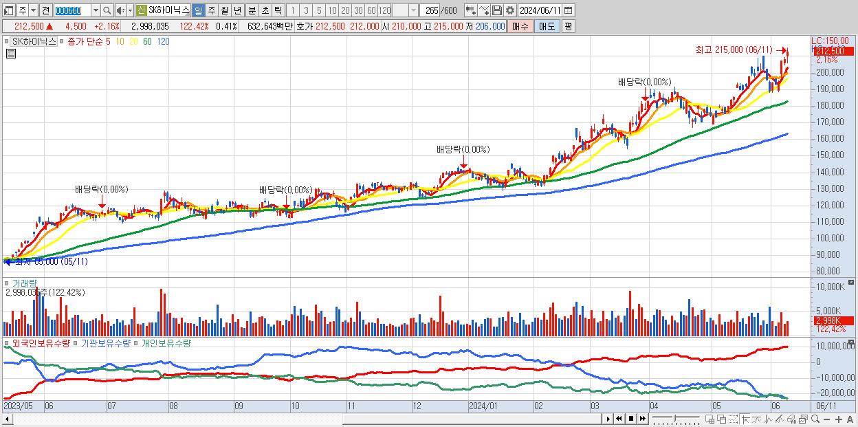 - SK하이닉스 (212,500원 ▲ 2.16% , 시총: 1,547,005억, 거래량: 2,998,035, 거래대금:6,326억, KOSPI)