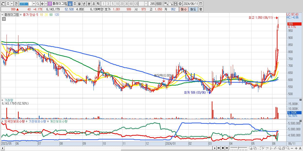 - 플레이그램 (999원 ▲ 4.17% , 시총: 1,266억, 거래량: 6,143,179, 거래대금:61억, KOSPI)