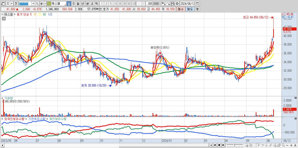 - 에스엘 (41,600원 ▲ 6.67% , 시총: 19,323억, 외국인 순매수 거래금:47억)