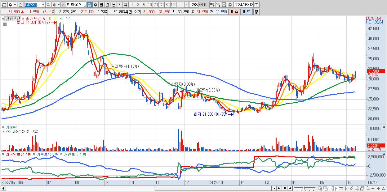 - 한화오션 (31,900원 ▲ 5.11% , 시총: 97,728억, 외국인 순매수 거래금:46억)