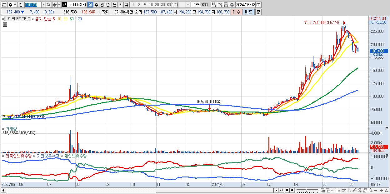 - LS ELECTRIC (187,400원 ▼ -3.8% , 시총: 56,220억, 외국인 순매수 거래금:89억)