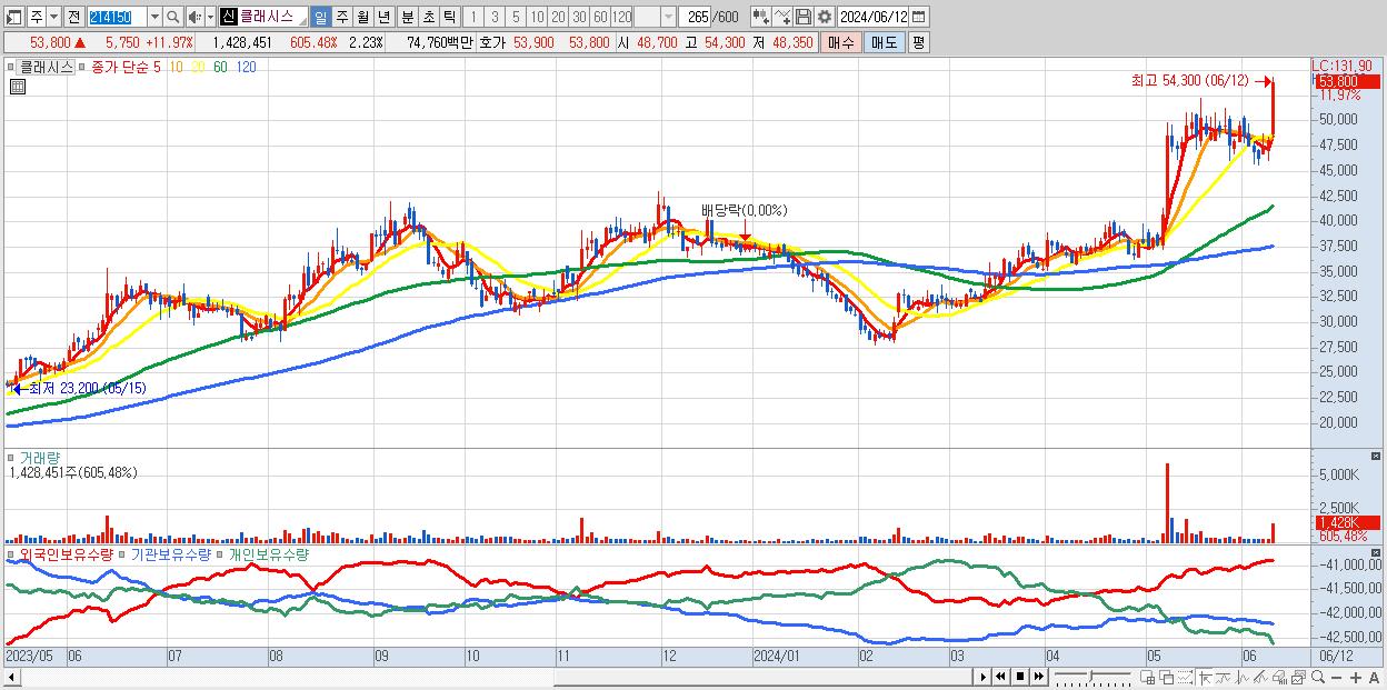 - 클래시스 (53,800원 ▲ 11.97% , 시총: 34,432억, 외국인 순매수 거래금:125억)