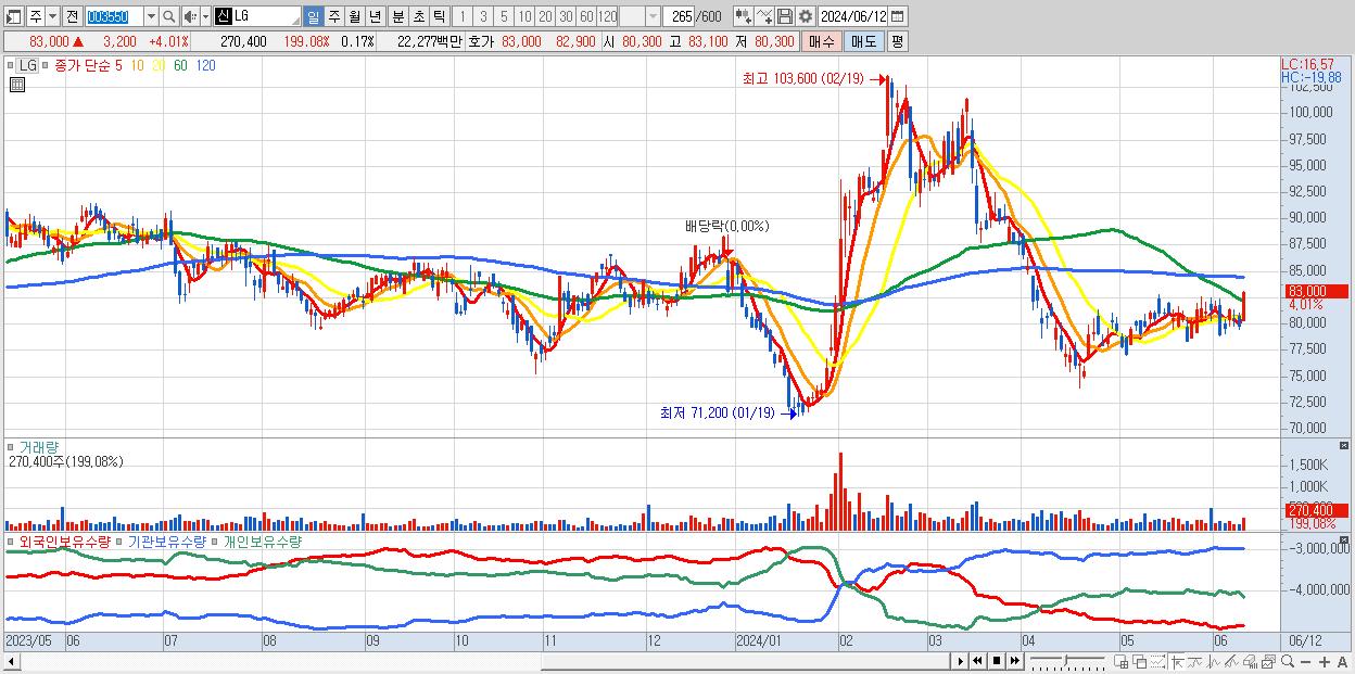 - LG (83,000원 ▲ 4.01% , 시총: 130,560억, 외국인 순매수 거래금:91억)