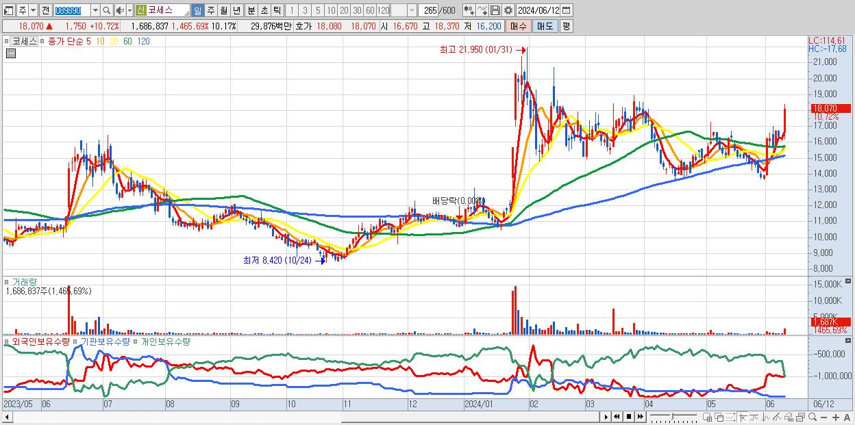 - 코세스 (18,070원 ▲ 10.72% , 시총: 2,997억, 외국인 순매수 거래금:52억)