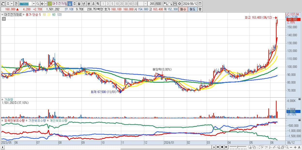 - 대주전자재료 (160,000원 ▲ 2.7% , 시총: 24,769억, 외국인 순매수 거래금:128억)