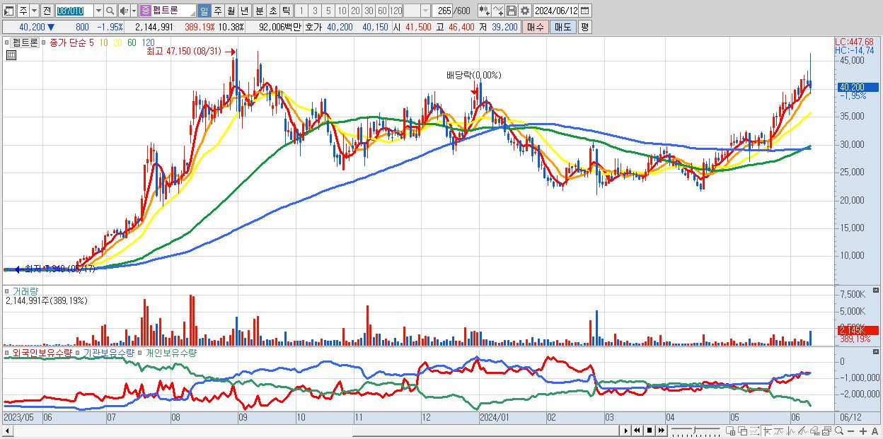 - 펩트론 (40,200원 ▼ -1.95% , 시총: 8,304억, 외국인 순매수 거래금:93억)