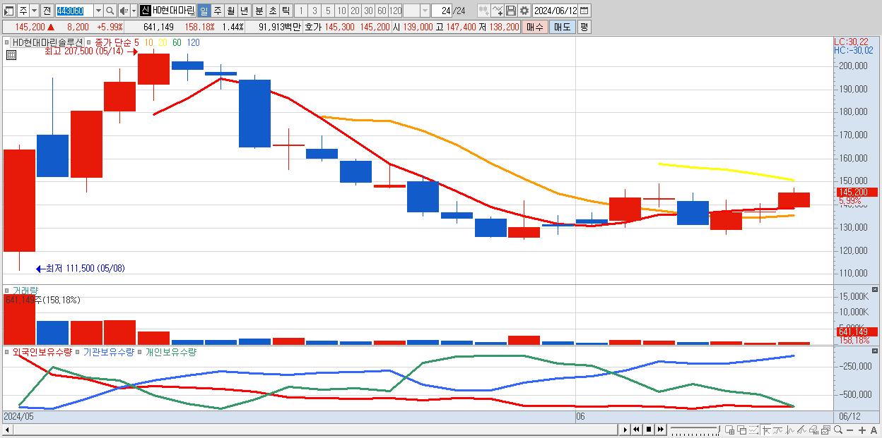 - HD현대마린솔루션 (145,200원 ▲ 5.99% , 시총: 64,541억, 외국인 순매수 거래금:56억)