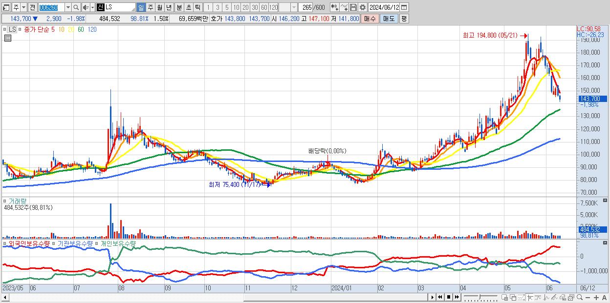 - LS (143,700원 ▼ -1.98% , 시총: 46,271억, 외국인 순매수 거래금:158억)