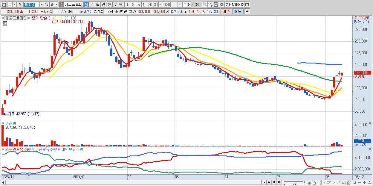 - 에코프로머티 (133,000원 ▲ 0.91% , 시총: 91,750억, 외국인 순매수 거래금:162억)