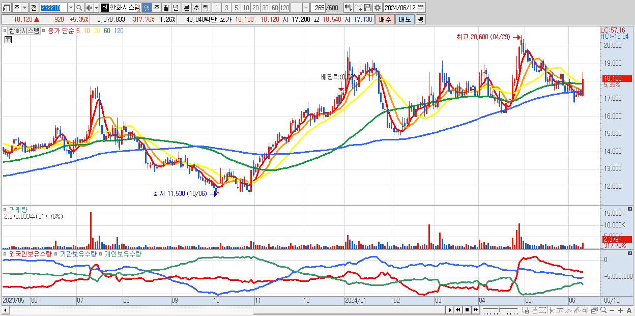 - 한화시스템 (18,120원 ▲ 5.35% , 시총: 34,232억, 외국인 순매수 거래금:62억)